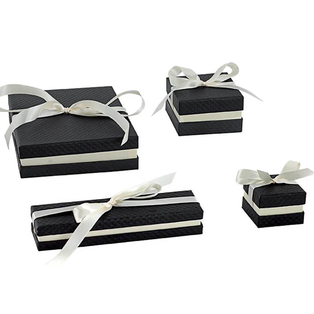 Astuccio con fondo e coperchio, in cartoncino goffrato colore nero con dettagli avorio, avvolto da un nastro in doppio raso avorio.