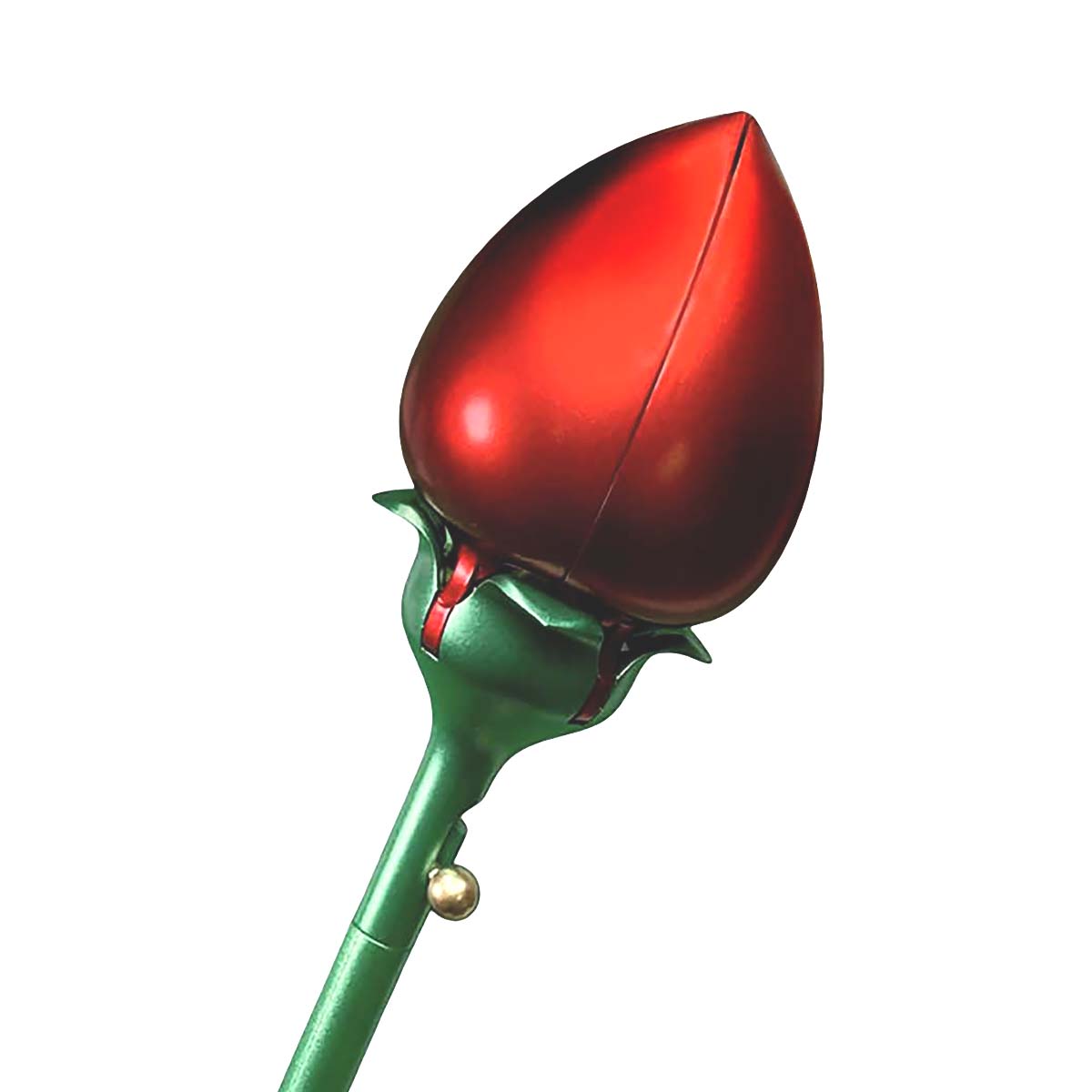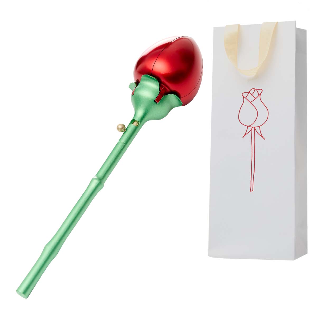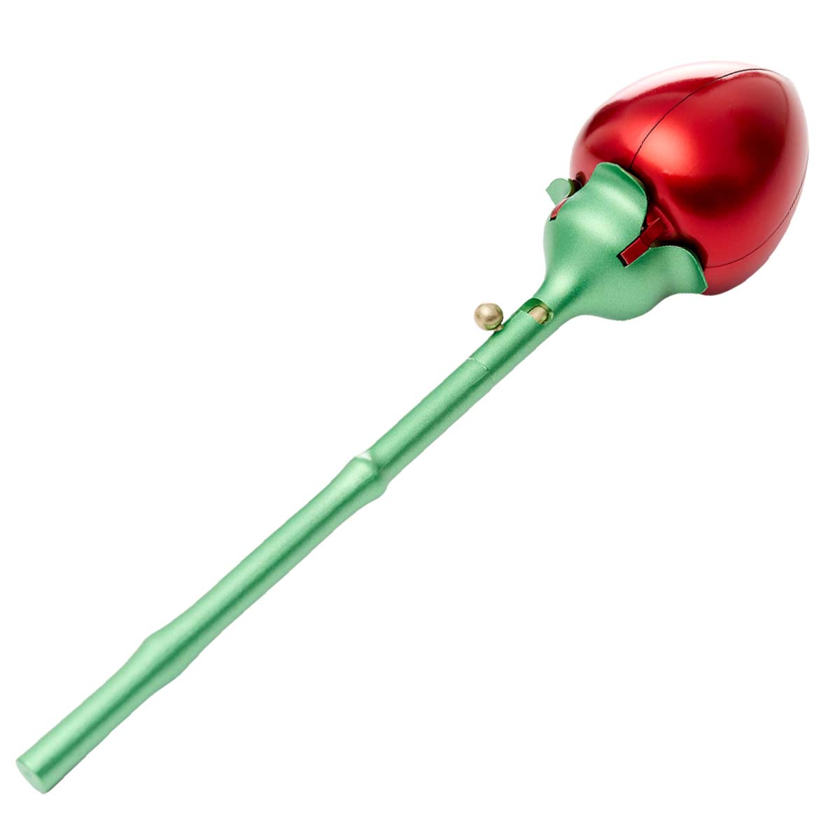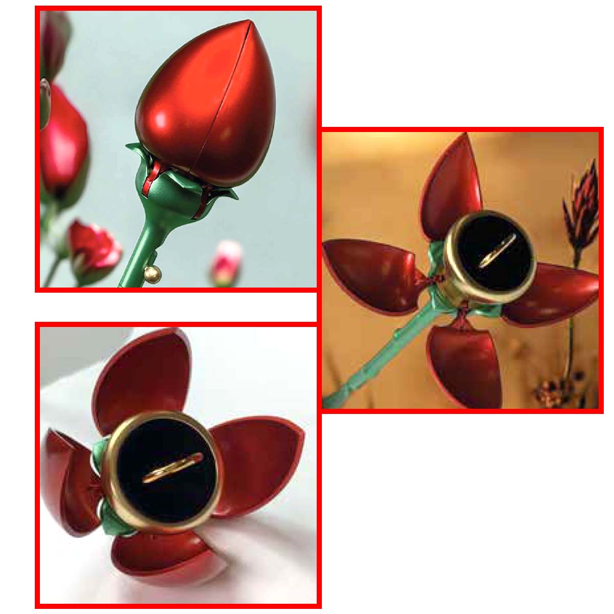 Astuccio incernierato, in metallo colore rosso , con stelo e pulsante per apertura dei petali.