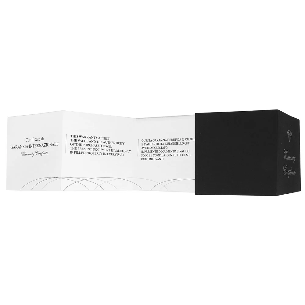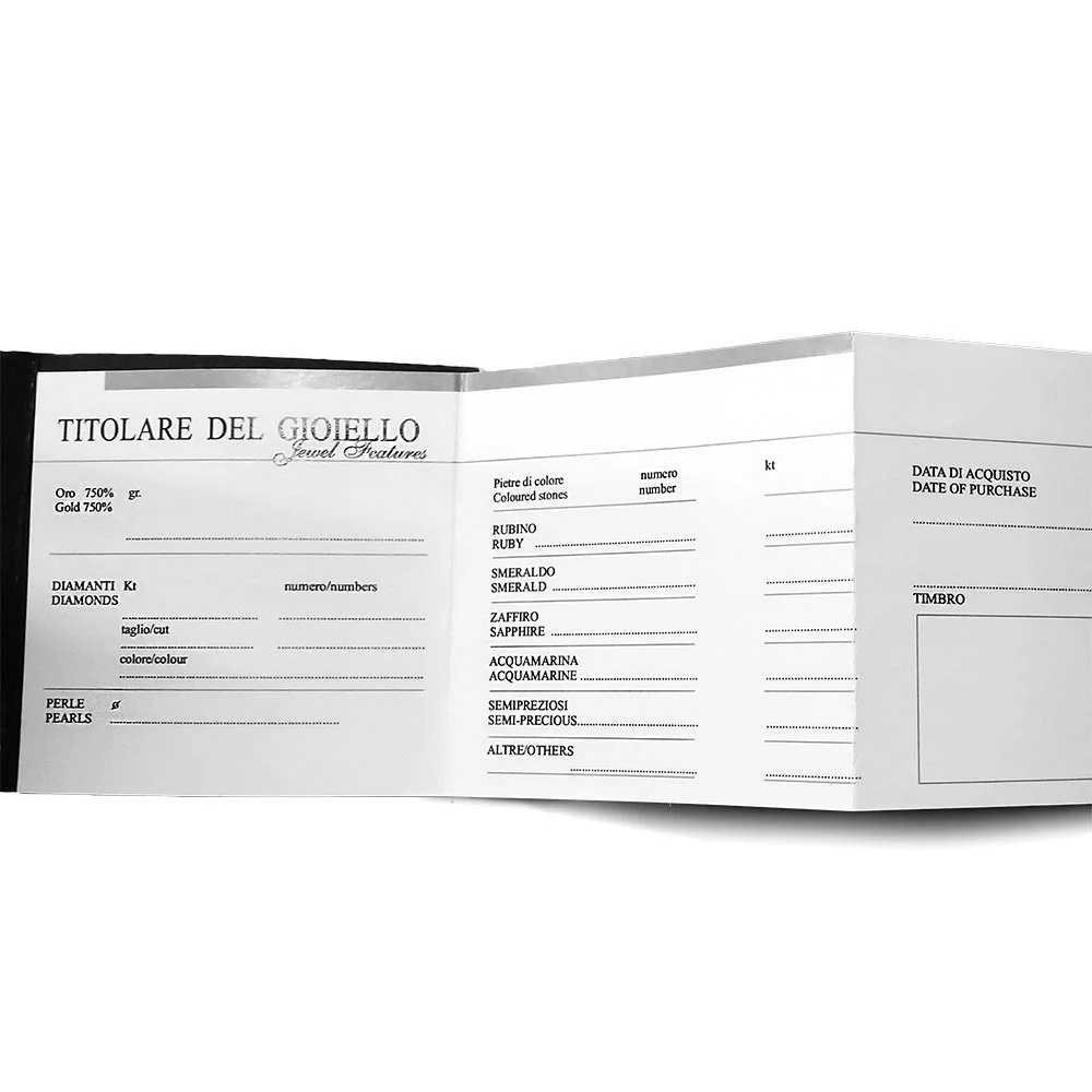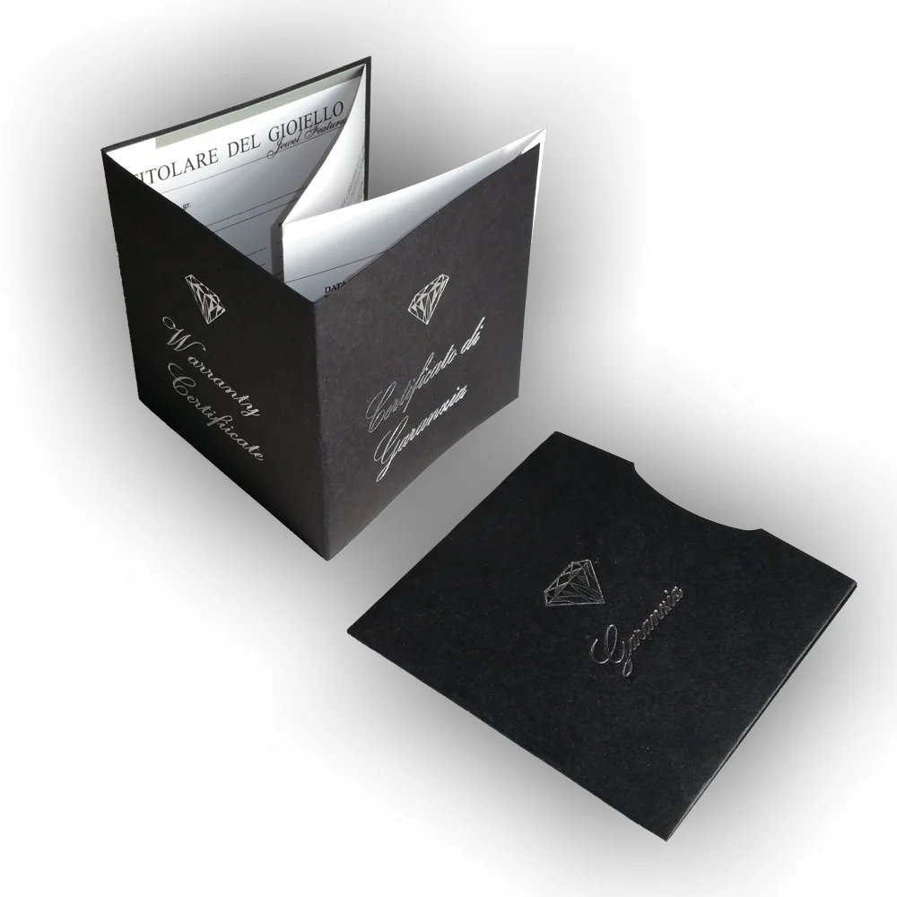 Certificati di garanzia in cartoncino nero con testo Certificato di Garanzia in color argento e bustina a fiammifero.