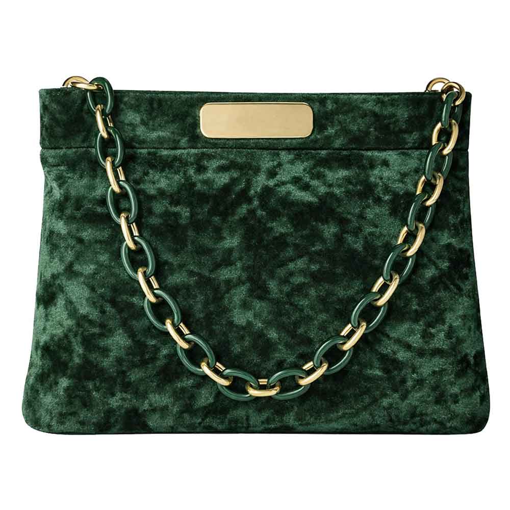Borsa extra lusso in morbido velluto con effetto cangiante, eleganti cuciture sul risvolto, soffietto solo sulla base.