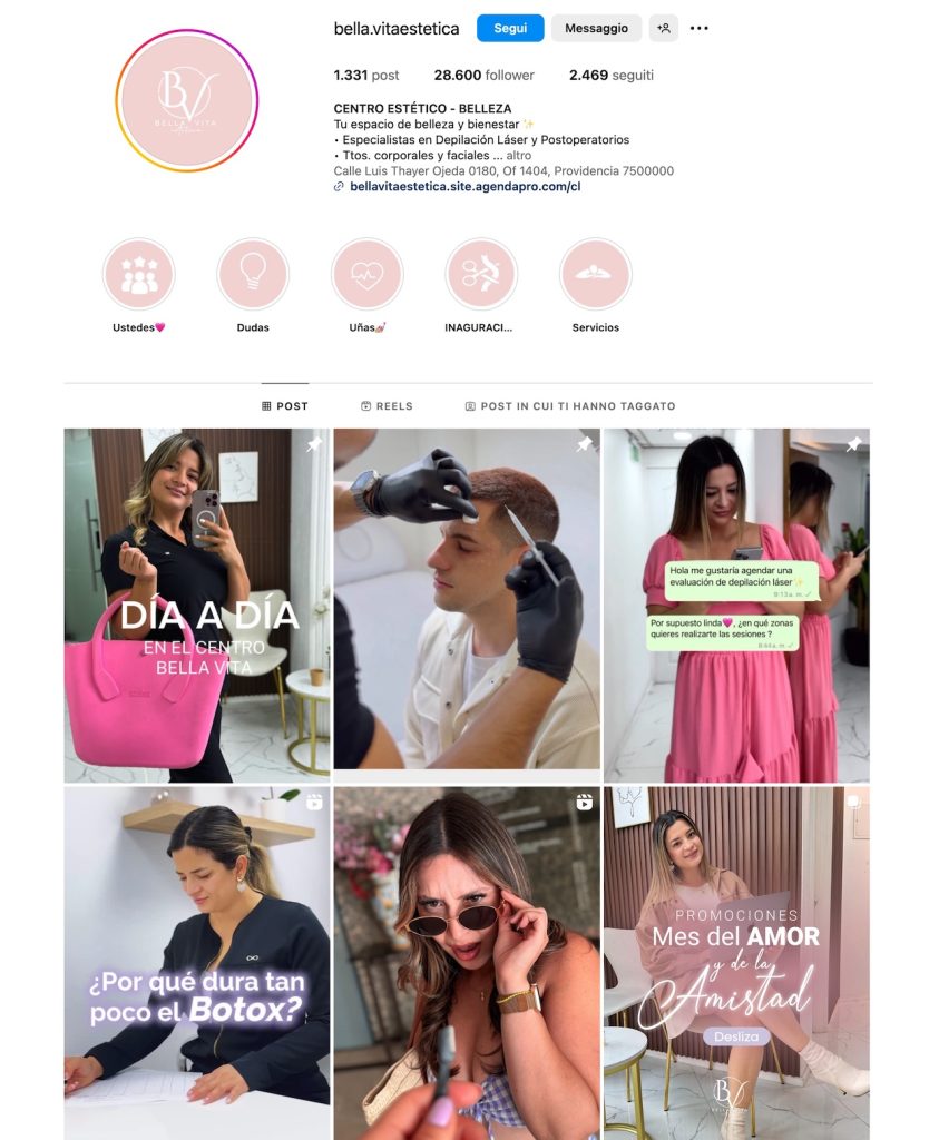 Il centro estetico Bella Vita Estetica invece adotta un approccio più informale. Molto ironico, ma alternato a video professionali e post sui servizi offerti che coinvolgono i clienti.