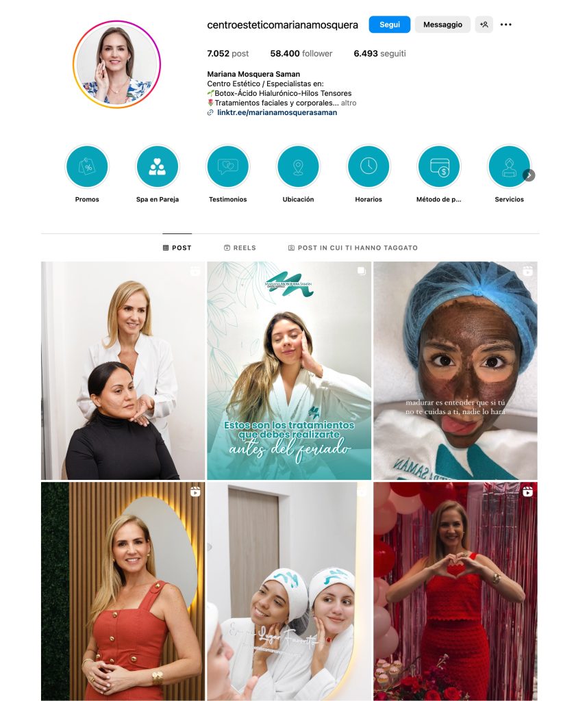 Il profilo instagram di questo centro estetico spagnolo di Mariana Mosquera è un ottimo esempio di content mix efficace. Dove si alternano diverse tipologie di post e la titolare “mette la faccia”, mostrando il proprio lavoro e promuovendo le offerte del centro estetico.